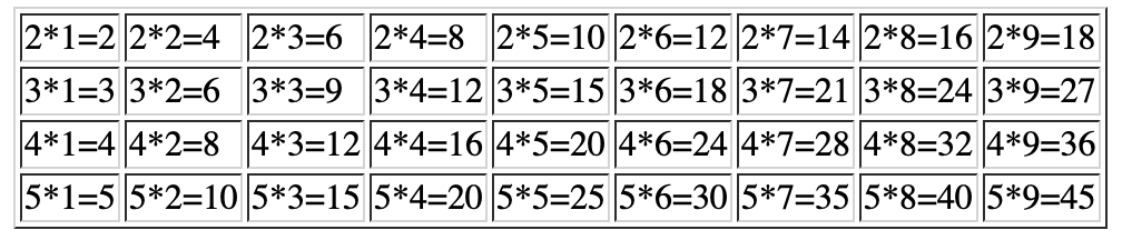 <td>${i}*${j}=${i*j}</td>