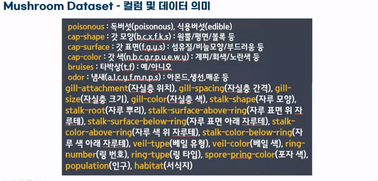- 버섯의 특징을 활용해 독/식용 이진 분류