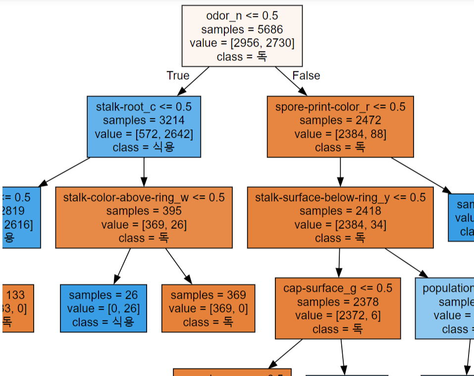 - 특성의 중요도를 파악 확인(불순한 정도를 파악하는 것: 지니 불순도)