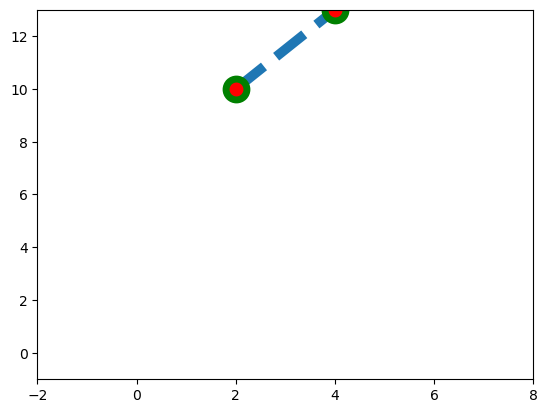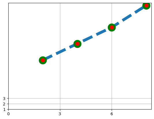 plt.plot(x, y, ls = '--', lw = 7, marker='o', mfc = 'r', mec = 'g', ms = 15, mew = 5)
