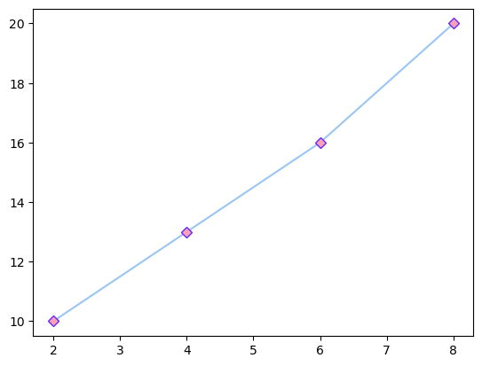 plt.plot(x, y, color = '#9AC5F4', marker='D', mfc='#FBA1B7', mec='#6528F7')