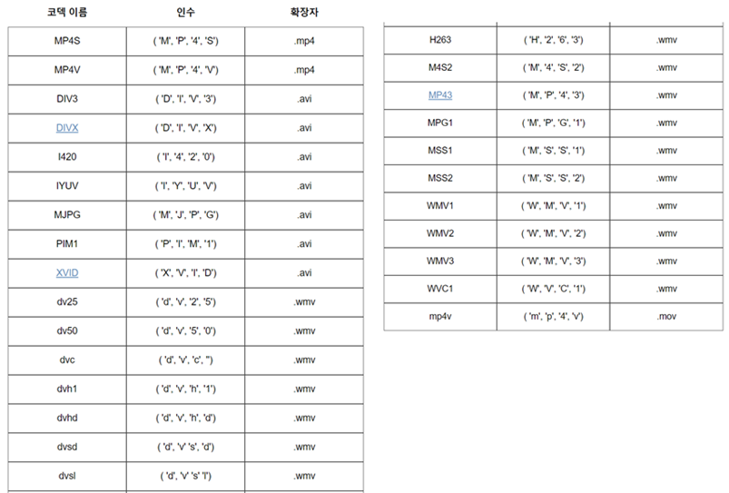 - codec = cv2.VideoWriter_fourcc('D', 'I', 'V', 'X') : 비디오 타입을 DIVX로 설정